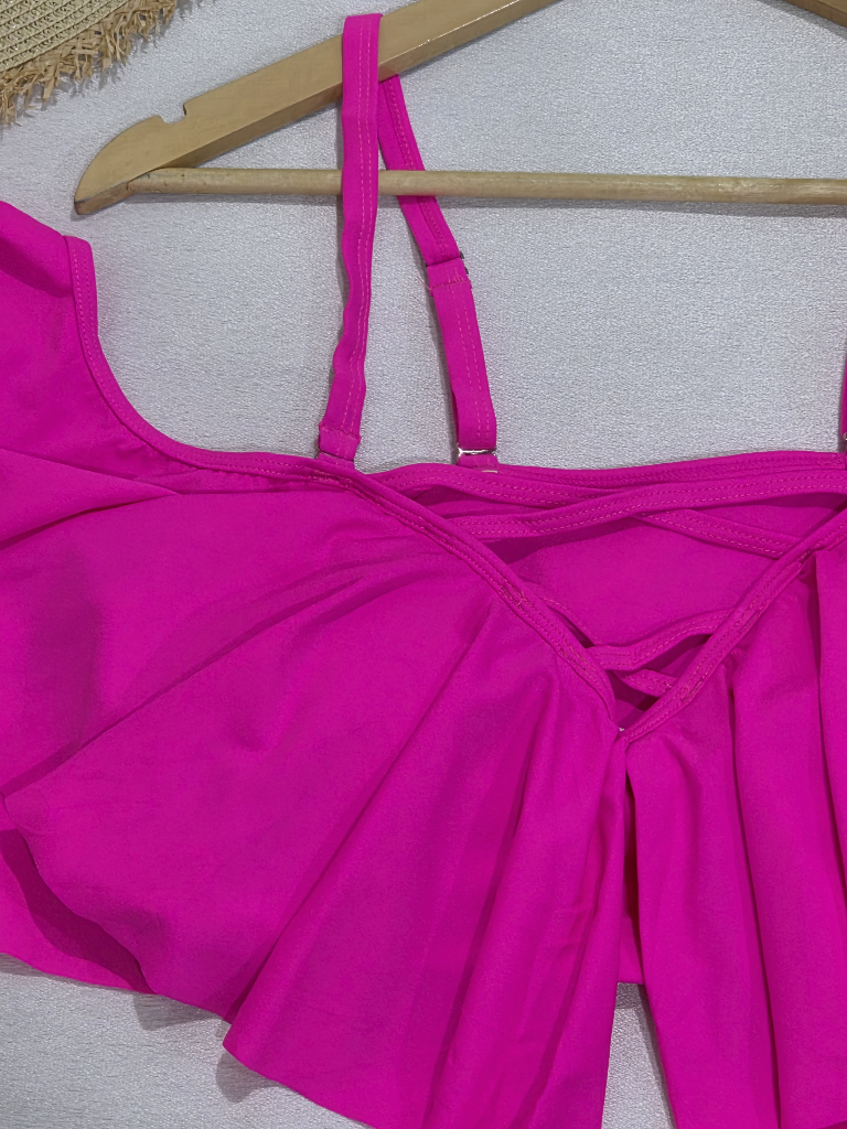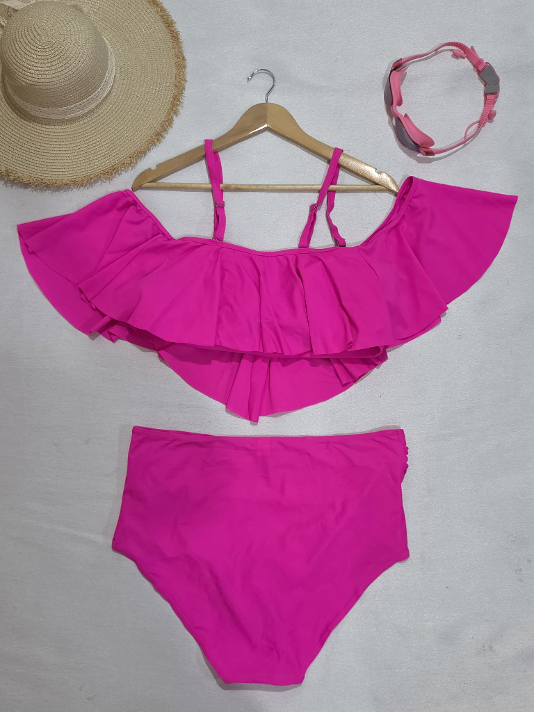 این مدل تنکینی شامل بالاتنه یقه قایقی (روی شانه قرار میگیرد) و شورت بلند است؛ ترکیبی از استایل زنانه، پوشیدگی مناسب و راحتی در حرکت.